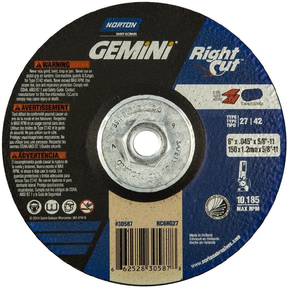 Outfit your right angle grinder with this economical Gemini® RightCut® A AO Type 27/42 cutting wheel, which features an aluminum oxide grain for consistent performance. The wheel has a durable bond designed to cut at high rates and ensure a long product life. An ultra-thin depressed center lets you use the wheel precisely to minimize material loss during grinding. This Gemini® RightCut® wheel is designed to deliver optimal results on 400 series stainless, hard or soft carbon steels.