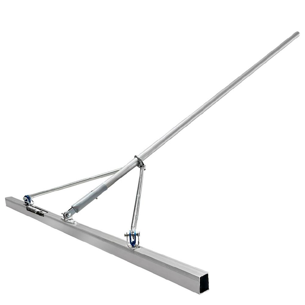 Float, screed, and level concrete slabs with this easy to use straightedge. A 5' blade of Genuine Extru-Lite™ Magnesium forms the base of the tool. Magnesium is 30% lighter than similar aluminum straight edges. The 1-3/8" wide bottom edge features a round edge for floating and a square edge for cutting and filling. This blade levels and places concrete fast. The twist of a wingnut allows the handle to tilt to the right floating angle. The tool is fitted with heavy-duty braces to balance the long blade. The braces connect to a collar for easy tool adjustments. Quick release pins on the braces allow for ease in set up and breakdown of the tool. The 72" long, 1-3/8" diameter button bull float handle is included for an extended reach. The anodized aluminum handle prevents hands from turning black caused by oxidation. Additional handles can be added to further extend the reach of the tool. End caps on the blade eliminate potential for build up of material. Ships unassembled. Proudly made in the USA.