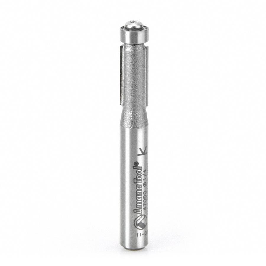 Use this flush trimming bit for laminate work or for template and pattern work. For template application, the bearing follows the template, while the cutting edges trim the workpiece. With the router handheld, the template is on the bottom of the work. With a table-mounted router, the template is on top. A two-flute bit is a good general-purpose choice, providing fast cuts and good finishes. Excellent for template work. 1/4" diameter for closer inside corner cutting only; bearings not guaranteed due to size.